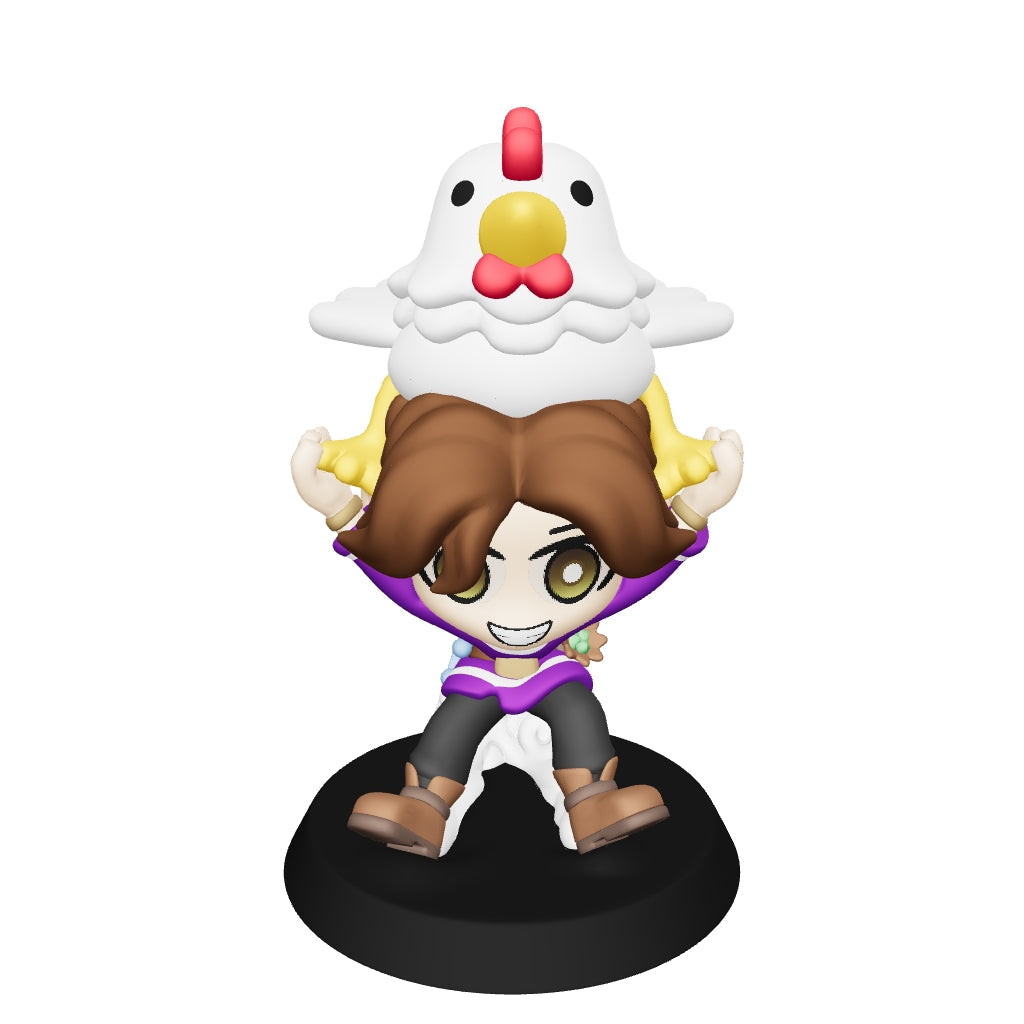 Le personnage représenté est celui de Julgane : il vient d’atterrir au sol en utilisant une poule pour voler, laissant derrière lui une traînée de fumée. Cette figurine est remplie de références à son univers.